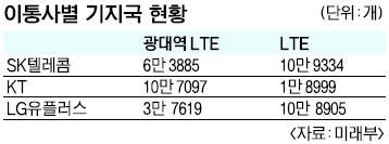 ¹Ì·¡ºÎ¿¡ µû¸£¸é LTE¿¡ ºñÇØ ±¤´ë¿ª LTE ´ë¿ªÀÇ ¼ºñ½º ÁúÀÌ ³ô´Ù. ¶§¹®¿¡ ±¤´ë¿ª LTE ´ë¿ªÀÌ °æÀï»çº¸´Ù ÀûÀº SKÅÚ·¹ÄÞÀÌ ´Ü¼ø ±âÁö±¹ÀÇ ÇÕÀ» ³»¼¼¿ì´Â ²Ä¼ö¸¦ ºÎ¸° ¼ÀÀÌ´Ù. SKÅÚ·¹ÄÞÀº ±¤´ë¿ª LTE ±âÁö±¹ÀÌ KT(10¸¸ 7097)¿¡ ºñÇØ ¾à 4¸¸°³ Àû´Ù. ´Ü¼ø ±âÁö±¹ ÇÕÀ¸·Î´Â SKÅÚ·¹ÄÞÀÌ 17¸¸ 3219°³·Î ÀÌÅë 3»ç Áß °¡Àå ¸¹´Ù. ÀÌ¿¡ ´ëÇØ SKÅÚ·¹ÄÞ °ü°èÀÚ´Â ¡°±âÁö±¹ ½Å°í ±âÁØÀº ±¹¼Ò ´ÜÀ§¿©¼ ½Ç³»³ª ÁöÇÏ¿¡ ¼³Ä¡ÇÑ ¼ÒÃâ·Â ±âÁö±¹ÀÌ Åë°è¿¡¼ ºüÁ³´Ù. Àüü ¼ýÀÚ´Â 21¸¸°³°¡ ¸Â´Ù¡±¸é¼ ¡°±âÁö±¹ÀÌ ¸¹À»¼ö·Ï ÃÎÃÎÇÑ ¼ºñ½º°¡ °¡´ÉÇÏ´Ù¡±°í ÇØ¸íÇß´Ù.