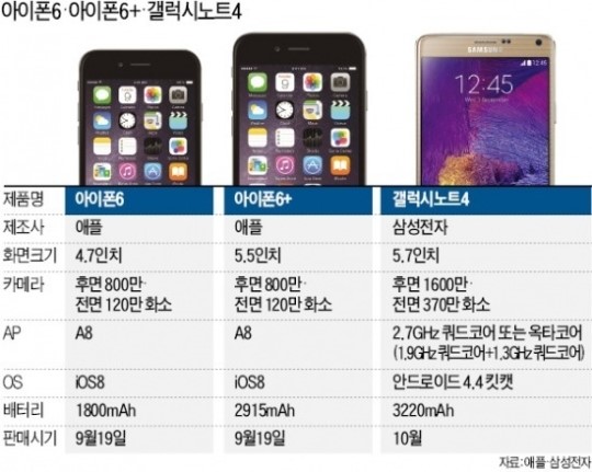 ¾ÖÇÃÀÇ ´ëÈ­¸é ½º¸¶Æ®Æù ¾ÆÀÌÆù6 Ç÷¯½º´Â »ï¼ºÀüÀÚ°¡ Áö³­ 3ÀÏ °ø°³ÇÑ ¡®°¶·°½Ã³ëÆ®4¡¯¿Í ¸ÂºÙ´Â´Ù. È­¸é Å©±â´Â °¶·°½Ã³ëÆ®4°¡ 5.7ÀÎÄ¡·Î ¾ÆÀÌÆù6 Ç÷¯½ºº¸´Ù 0.2ÀÎÄ¡ Å©´Ù. Ä«¸Þ¶ó ÇØ»óµµ´Â °¶·°½Ã³ëÆ®4°¡ ´õ ¶Ù¾î³ª´Ù. Èĸé 1600¸¸, Àü¸é 370¸¸ È­¼Ò·Î ¾ÆÀÌÆù6 Ç÷¯½º(Èĸé 800¸¸¡¤Àü¸é 120¸¸ È­¼Ò)º¸´Ù ³ô´Ù. ¹èÅ͸® ¿ë·®µµ °¶·°½Ã³ëÆ®4°¡ Å©´Ù. ¾ÆÀÌÆù6 Ç÷¯½º´Â 2915mAh, °¶·°½Ã³ëÆ®4´Â 3220mAh´Ù. ¹«°Ô´Â ¾ÆÀÌÆù6 Ç÷¯½º°¡ 172gÀ¸·Î °¶·°½Ã³ëÆ®4(176g)º¸´Ù °¡º±´Ù.