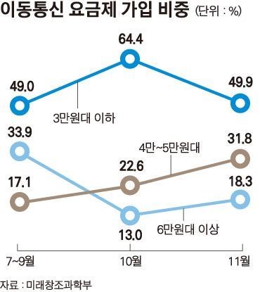 2ÀÏ ¹Ì·¡ºÎ¿¡ µû¸£¸é Áö³­´Þ À̵¿Åë½Å ¿ä±ÝÁ¦ °¡ÀÔ ºñÁß¿¡¼­ ¿ù 6¸¸¿ø´ë ÀÌ»ó °í°¡ ¿ä±ÝÁ¦ °¡ÀÔÀÚ°¡ 18.3%·Î Àü¿ùÀÎ 10¿ùÀÇ 13%º¸´Ù Áõ°¡Çß´Ù. Áß°¡ ¿ä±ÝÁ¦ÀÎ ¿ù 4¸¸~5¸¸¿ø´ë °¡ÀÔÀÚµµ 31.8%·Î, Àü¿ù 22.6%º¸´Ù ´Ã¾î³µ´Ù. ¹Ý¸é 3¸¸¿ø ¹Ì¸¸ Àú°¡ ¿ä±ÝÁ¦ °¡ÀÔÀÚ´Â Àü¿ù 64.4%¿¡¼­ 49.9%·Î Å©°Ô ¶³¾îÁ³´Ù.