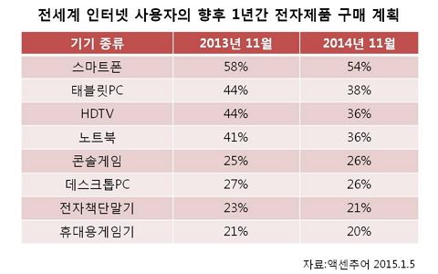½ÃÀåÁ¶»ç¾÷ü À̸¶ÄÉÅÍ´Â 19ÀÏ(ÇöÁö½Ã°£) ¾×¼¾Ã߾ ÃÖ±Ù ¹ßÇ¥ÇÑ Á¶»ç °á°ú¸¦ ÀοëÇØ 2013³â 11¿ùºÎÅÍ 2014³â 11¿ù±îÁö ¾à 1³â°£ ÇâÈÄ 1³â ¾È¿¡ ÀüÀÚÁ¦Ç° ±¸¸Å °èȹÀ» ºñ±³ÇØ º» °á°ú, Àü¼¼°è ÀÎÅÍ³Ý »ç¿ëÀÚµéÀÇ ±â±â ±¸¸Å Àǵµ°¡ ´Ù¼Ò ÁÙ¾ú´Ù°í ¹ßÇ¥Çß´Ù. ƯÈ÷ ½º¸¶Æ®Æù, ÅÂºí¸´, HDTV, ³ëÆ®ºÏÀÌ ÀüÀÚÁ¦Ç° ±¸¸Å ½ÃÀåÀ» ÁÖµµÇϰí Àִµ¥, 2013³â¿¡´Â ÇâÈÄ 1³â ¾È¿¡ ½º¸¶Æ®Æù ±¸¸Å Àǵµ°¡ ÀÖ´Â »ç¶÷Àº 58%¿´´ø ¹Ý¸é, Áö³­ÇØ´Â 54%·Î 4%p ÁÙ¾ú´Ù.