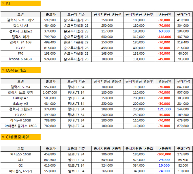 KT¿¡¼´Â ´Ü¸»±â 7Á¾¿¡¼ °ø½Ãº¸Á¶±ÝÀÌ ¶³¾îÁ³´Âµ¥, °¡Àå Å©°Ô ÇÏÇâµÈ °ÍÀº °¶·°½Ã ¸Þ°¡·Î 33¸¸8000¿øÀ̳ª ³·ÃçÁ³´Ù. ±× ´ÙÀ½ ¸¹ÀÌ ¶³¾îÁø °ÍÀº °¶·°½Ã³ëÆ®3 ³×¿À·Î 7¸¸8000¿ø, °¶·°½Ã A5¿Í °¶·°½ÃS4 16GB´Â °¢°¢ 7¸¸¿ø ¶³¾îÁ³´Ù. LG G2, F70, ¾ÆÀÌÆù6 64±â°¡ÀÇ °ø½Ãº¸Á¶±ÝÀº 3~5¸¸¿ø »çÀÌ¿¡¼ Ç϶ôÇß´Ù.
