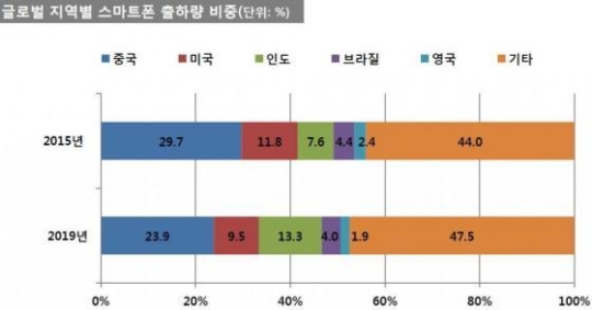 ¿ÃÇØ ±Û·Î¹ú ½º¸¶Æ®Æù ½ÃÀå¿¡¼­ ±¹°¡º° ºñÁßÀº Áß±¹ÀÌ 29.7%·Î °¡Àå Å©°í, ¹Ì±¹(11.8%), Àεµ(7.6%)¼øÀÌÁö¸¸, 4³â µÚÀÎ 2019³â¿¡´Â Áß±¹°ú ¹Ì±¹ ºñÁßÀÌ °¢°¢ 23.9%, 9.5%·Î ÁÙ°í Àεµ ½ÃÀåÀÇ ºñÁßÀÌ 13.3%·Î È®´ëµÉ °ÍÀ¸·Î ¿¹»óµÆ´Ù. Àεµ°¡ ¹Ì±¹À» Á¦Ä¡°í Áß±¹ ´ÙÀ½ Å« ½º¸¶Æ®Æù ½ÃÀåÀ¸·Î ºÎ»óÇÑ´Ù´Â ¾ê±â´Ù.