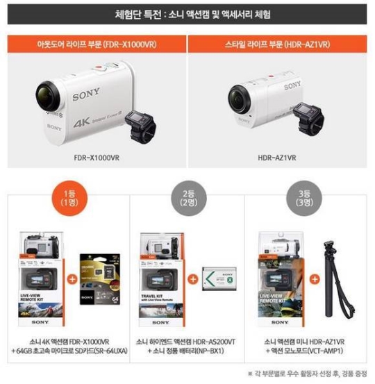 À̹ø üÇè´ÜÀº ÃʰíÈ­Áú(UHD, 4K) µ¿¿µ»ó ÃÔ¿µÀÌ °¡´ÉÇÑ 4K ¾×¼ÇÄ· ¡®FDR-X1000V¡¯¸¦ üÇèÇÒ ¡®¾Æ¿ôµµ¾î ¶óÀÌÇÁ(Outdoor Life)¡¯ ºÎ¹® 10¸í, ÇÏÀÌ¿£µå ¾×¼ÇÄ· ¹Ì´Ï ¡®HDR-AZ1¡¯À» üÇèÇÒ ¡®½ºÅ¸ÀÏ ¶óÀÌÇÁ(Style Life)¡¯ ºÎ¹® 10¸í µî 2°³ ºÎ¹® ÃÑ 20¸íÀ¸·Î ±¸¼ºµÈ´Ù.