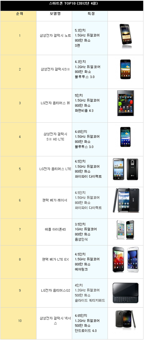 ÀÌ ¿Ü¿¡´Â °¶·°½ÃS¥± HD LTE¿Í ¿ÉƼ¸Ó½º LTE, ÆÒÅà º£°¡ LTE EX µîÀÌ ¼øÀ§¿¡ À̸§À» ¿Ã·È´Ù. °¡Àå ÃÖ±Ù¿¡ ³ª¿Â LTEÆùÀ¸·Î´Â LGÀüÀÚ°¡ NFC(±Ù°Å¸®¹«¼±Åë½Å) ±â´É¿¡ Ưȭ½ÃŲ 4ÀÎÄ¡ Å©±â ¿ÉƼ¸Ó½º LTE űװ¡ ÀÖ´Ù.