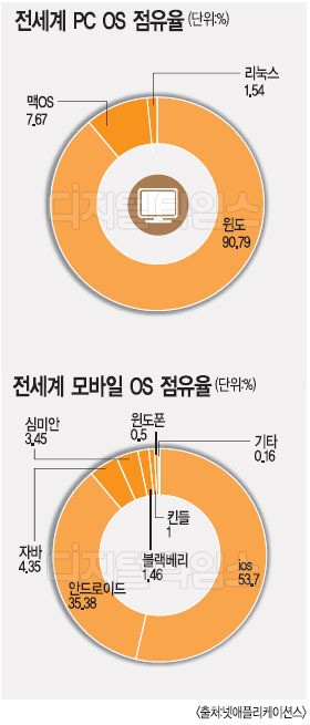 ¸ð¹ÙÀÏ¿¡¼­ À©µµ ¿µÇâ·ÂÀÌ ¾àÇÑ °Íµµ ±âȸ·Î ²ÅÈ÷°í ÀÖ´Ù. ½º¸¶Æ®Æù°ú ÅÂºí¸´ µî ¸ð¹ÙÀÏ OSºÎ¹®Àº ¾ÖÇà iOS°¡ 53.7%, ±¸±Û ¾Èµå·ÎÀ̵尡 35.38%¸¦ Â÷ÁöÇϰí ÀÖÁö¸¸, MS À©µµÆùÀº 0.5%¿¡ ºÒ°úÇÏ´Ù. ÇâÈÄ ¸ð¹ÙÀÏ ±â±â »ç¿ë·®ÀÌ PC »ç¿ë·®À» Áö¼ÓÀûÀ¸·Î ³Ñ¾î¼³ °ÍÀ» °¨¾ÈÇÒ ¶§, PC OSº¸´Ù ¸ð¹ÙÀÏ OS¿¡ ÁýÁßÇÒ Çʿ䰡 ÀÖ´Ù. µ¶ÀÚ OS°³¹ßÀ» ÃßÁøÇß´ø Áß±¹ÀÌ PC OS´Â Æ÷±âÇϰí, ¸ð¹ÙÀÏ OS°³¹ß¿¡ ÁýÁßÇÑ °Íµµ ´« ¿©°Ü ºÁ¾ßÇÒ ºÎºÐÀÌ´Ù.