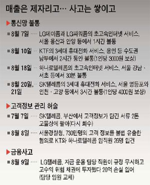 [Áß¾ÓÀϺ¸ ±è¿ø¹è] ±¹³» Åë½Å¾÷ü¿¡ ÀÕµû¶ó ¾ÇÀç°¡ ÅÍÁö°í ÀÖ´Ù. Åë½Å¸ÁÀÌ µÎÀýµÇ°í °í°´ Á¤º¸°¡ ³ªµ¹¾Æ ´Ù´Ï´Â µ¥ ±×Ä¡Áö ¾Ê°í ±Þ±â¾ß ±ÝÀ¶»ç°í±îÁö ÅÍÁ³´Ù. °¡¶àÀ̳ª ¸ÅÃâÀÌ ´ÃÁö ¾Ê¾Æ °í¹Î ÁßÀÎ Åë½Å¾÷üÀÇ ºÐÀ§±â°¡ µÚ¼þ¼þÇÒ ¼ö¹Û¿¡ ¾ø´Ù. ´ëÇü »ç°í°¡ ¹ß»ýÇϱâ Àü¿¡ 29°ÇÀÇ Áß°£ ±Ô¸ð »ç°í°¡ ÀϾ°í, ±×¿¡ ¾Õ¼ À§Çè¿¡ 300Â÷·Ê ³ëÃâµÈ´Ù´Â ¡®ÇÏÀθ®È÷ÀÇ ¹ýÄ¢¡¯À» ¶°¿Ã¸®°Ô ÇÑ´Ù.