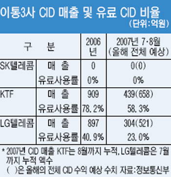 KTF¿Í LGÅÚ·¹ÄÞÀº ÇöÀç CID¸¦ °¢°¢ ¿ù 1000¿ø, 2000¿ø¾¿¿¡ À¯·á Á¦°ø ÁßÀÌ´Ù. ¿ÃÇØ ÀÌµé ¾÷üµéÀÌ CID·Î °ÅµÑ ¼öÀÍÀº °¢°¢ 658¾ï¿ø, 521¾ï¿ø(¿¹»óÄ¡)¿¡ ´ÞÇÑ´Ù. Áö³­ÇØ ÀÌµé ¾÷üµéÀÌ ¹ú¾îµéÀÎ CID¼öÀÍÀº ¾÷üº°·Î 909¾ï¿ø, 897¾ï¿ø¿¡ ´ÞÇß´Ù. ¾÷üµé·Î¼± Æ÷±âÇϱ⠾î·Á¿î ¾ËÂ¥ ¼öÀÍ¿øÀÎ ¼ÀÀÌ´Ù.