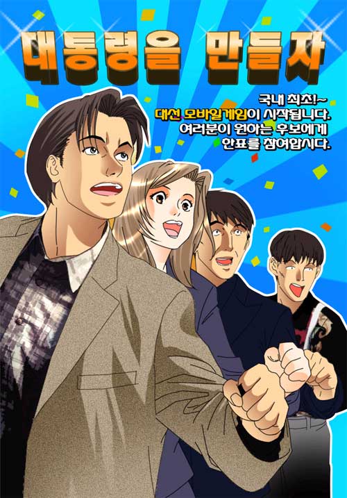 ÄÚ¸®¾ÆÄÁÅÙÃ÷³×Å©¿öÅ©(´ëÇ¥ ½Å±¤½Â)¿¡¼­ ÆÛºí¸®½ÌÇÑ £¢´ëÅë·ÉÀ» ¸¸µéÀÚ£¢´Â ÇöÀç SKT/KTF¸¦ ÅëÇØ ¼­ºñ½º µÇ°í ÀÖÀ¸¸ç, Á÷Á¢ ´ë¼±È常¦ ¼±ÅÃÇÏ°í ¼±°Å¿îµ¿À» ÅëÇØ ÁöÁöÀ²À» ¿Ã·Á ´ëÅë·É¿¡ ´ç¼± ½ÃŰ´Â °ÔÀÓÀÌ´Ù.
