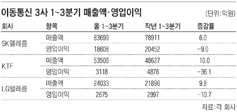 ¹Ý¸é ¿ÃÇØ »ç¾÷ ¼öÀͼºÀ» ³ªÅ¸³»´Â ¿µ¾÷ÀÌÀÍÀº À۳⺸´Ù ¾ÇÈ­µÆ´Ù. SKÅÚ·¹ÄÞÀº ¿Ã 1~3ºÐ±â ¿µ¾÷ÀÌÀÍÀÌ 1Á¶8608¾ï¿øÀ» ±â·Ï, À۳⠵¿±â(2Á¶452¾ï¿ø)º¸´Ù 9% °¨¼ÒÇß´Ù. KTF´Â 3118¾ï¿øÀ¸·Î À۳⠵¿±â ´ëºñ 36.1% ÁÙ¾ú°í, LGÅÚ·¹ÄÞµµ 10.7% °¨¼ÒÇÑ 2675¾ï¿ø¿¡ ¸Ó¹°·¶´Ù. ¼öÀͼº ¾ÇÈ­ÀÇ °¡Àå Å« ¿øÀÎÀº ¸¶ÄÉÆÃ ºñ¿ë Áõ°¡´Ù. ´ë½ÅÁõ±Ç À̵¿¼· ¾Ö³Î¸®½ºÆ®´Â ¡°SKÅÚ·¹ÄÞ°ú KTF°¡ 3¼¼´ë À̵¿Åë½Å(WCDMA) °¡ÀÔÀÚ È®´ë¸¦ À§ÇØ ¿¬¸»±îÁö ´ë´ëÀûÀÎ ±¤°í¿Í º¸Á¶±Ý °æÀïÀ» À̾°í ÀÖ¾î, ¿ÃÇØ ¿µ¾÷ ÀÌÀÍÀº À۳⺸´Ù 10% ÀÌ»ó °¨¼ÒÇÒ °ÍÀ¸·Î º¸Àδ١±°í ³»´ÙºÃ´Ù.