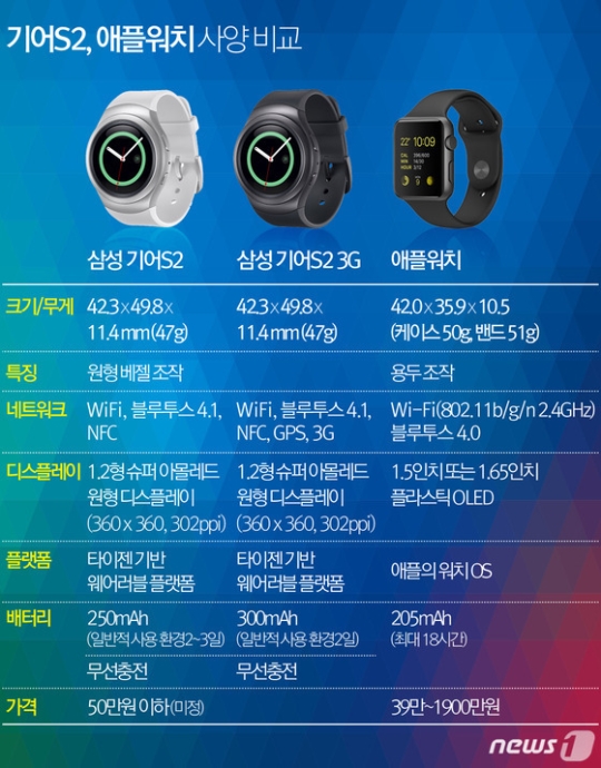 µÎ Á¦Ç°ÀÇ °¡Àå Å« Â÷ÀÌ´Â µð½ºÇ÷¹ÀÌ ¸ð¾ç¿Í Á¶ÀÛ ¹ýÀÌ´Ù. ±â¾îS2´Â ½ÇÁ¦ ½Ã°è°°Àº È­¸é¿¡ ½Ã°è Å׵θ®(º£Á©)À» µ¹·Á »ç¿ëÇÑ´Ù. ¾ÖÇÿöÄ¡´Â ½Ã°è ¿·¸é¿¡ ´Þ¸° ¿ëµÎ¸¦ »ç¿ëÇÑ´Ù. ¾÷°è °ü°èÀÚ´Â £¢½º¸¶Æ®¿öÄ¡´Â µð½ºÇ÷¹À̰¡ À۱⠶§¹®¿¡ ¼Õ°¡¶ôÀ¸·Î ÅÍÄ¡¸¦ Çϸé È­¸éÀ» °¡·Á ºÒÆíÇØ ÅÍÄ¡ ¿ÜÀÇ Á¶ÀÛ ¹æ¹ýÀÌ Áß¿äÇØÁö°í ÀÖ´Ù£¢°í ¼³¸íÇß´Ù.