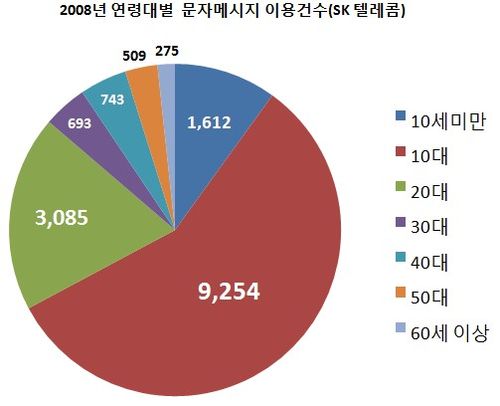 30´ë¿Í 40´ë°¡ °¢°¢ 693°Ç(58°Ç), 743°Ç(62°Ç)ÀÎ °Í°ú ºñ±³ÇßÀ» ¶§ µÎ ¹è¸¦ Èǽ ³Ñ´Â ¾çÀÇ ¹®ÀÚ¸Þ½ÃÁö¸¦ º¸³»´Â ¼ÀÀÌ´Ù. À̴ û¼Ò³âÃþÀº ¹°·Ð ¾î¸°À̵é±îÁö ¹®ÀÚ¸Þ½ÃÁö¸¦ ÁÖ¿ä Ä¿¹Â´ÏÄÉÀÌ¼Ç ¼ö´ÜÀ¸·Î »ï°í ÀÖÀ½À» º¸¿©ÁØ´Ù. 50´ë¿Í 60¼¼ ÀÌ»óÀº °¢°¢ 509°Ç(42°Ç), 275°Ç(23°Ç)À¸·Î ³ªÅ¸³µ´Ù.