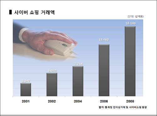 ƯÈ÷ »çÀ̹ö¼îÇÎ °Å·¡¾×Àº 18Á¶1460¾ï ¿øÀ¸·Î Àü³â 15Á¶7660¾ï ¿ø¿¡ ºñÇØ 15.1% Áõ°¡Çß´Ù. ¶Ç Áö³ÇØ ¸» ³óÇù°æÁ¦¿¬±¸¼Ò¿¡¼ ¹ßÇ¥ÇÑ ¡®2009 ±¹³»¼Ò¸Å½ÃÀå Àü¸Á¡¯¿¡¼´Â ¿ÃÇØ »çÀ̹ö¼îÇÎ ºÎ¹® ¿¹»ó ¸ÅÃâ¾×ÀÌ ÃÑ 21Á¶2000¾ï ¿øÀ¸·Î ¹éÈÁ¡À» Ãß¿ùÇÒ °ÍÀ¸·Î Àü¸ÁÇß´Ù.