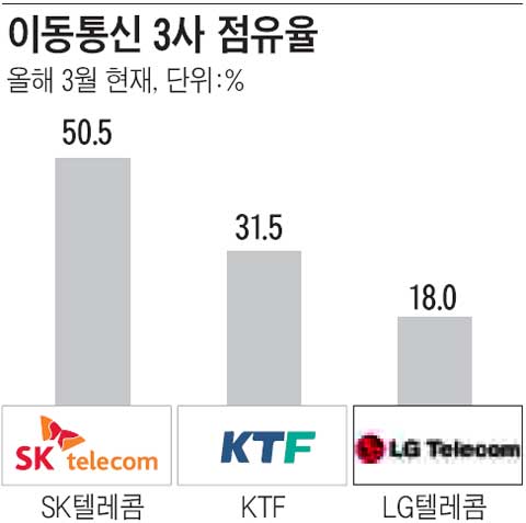 ÇöÀç À̵¿Åë½Å ½ÃÀå Á¡À¯À²Àº 5´ë3´ë2 ±¸µµ´Ù. 50.5%¸¦ ±â·ÏÇÑ SKÅÚ·¹ÄÞÀÌ ¼±µÎ°í, KTF¿Í LGÅÚ·¹ÄÞÀÌ °¢°¢ 31.5%, 18.0%¸¦ Â÷ÁöÇϰí ÀÖ´Ù. SKÅÚ·¹ÄÞÀÇ °æ¿ì, â»ç ÀÌ·¡ 50% ÀÌÇÏ·Î ³»·Á°£ ÀûÀÌ ¾ø´Ù. ´ëºÎºÐÀÇ Àü¹®°¡µéµµ À̵¿ÀüÈ­ ½ÃÀåÀÌ Æ÷È­µÈ »óȲ¿¡¼­ ÃâÇ÷ °æÀïÀº ÀϾÁö ¾ÊÀ» °ÍÀ̶õ ÀǰßÀ» ³»³õ°í ÀÖ´Ù.