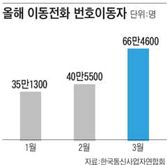 Çѱ¹Åë½Å»ç¾÷ÀÚ¿¬ÇÕȸ¿¡ µû¸£¸é À̵¿Åë½Å 3»ç ¹øÈ£À̵¿ °¡ÀÔÀÚ ¼ö´Â Áö³­ 1¿ù 35¸¸1300¸í¿¡¼­ 2¿ù 40¸¸5500¸íÀ¸·Î ¿Ã¶ó¼¹´Ù°¡ 3¿ù 66¸¸4600¸íÀ¸·Î ±ÞÁõÇß´Ù. ÀÛ³â 8¿ù ÀÌÈÄ ÃÖ°íÄ¡´Ù. ¿Ã 1¡¤2¿ù¿¡ ´«Ä¡ º¸´Â Ž»öÀüÀ» ¹úÀÌ´Ù°¡ Áö³­´ÞºÎÅÍ º»°Ý ÀüÅõ¸¦ ÆîÄ¡°í ÀÖ´Â ¼ÀÀÌ´Ù. ÀÌ·± Ãß¼¼´Â ÀÌ´Þ µé¾î °è¼ÓµÇ°í ÀÖ´Ù.