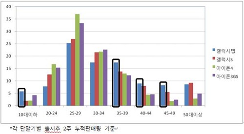 ¿¬·Éº° ºÐÆ÷¿¡¼­ ´«¿¡ ¶ç´Â Á¡Àº °¶·°½ÃS¿Í ¾ÆÀÌÆù4, ¾ÆÀÌÆù3GS µî ´Ù¸¥ °í°¡ ´Ü¸»±âÀÇ ÃÊ±â ÆÇ¸Å·®°ú ºñ±³ÇØ 35¼¼~49¼¼ ¿¬·ÉÃþÀÇ ±¸ÀÔ ºñÁßÀÌ ´«¿¡ ¶ç°Ô ³ô´Ù´Â °ÍÀÌ´Ù. 10´ë ÀÌÇÏ Ã»¼Ò³âÀÇ ±¸ÀÔ ºñÁßµµ »ó´ëÀûÀ¸·Î ³ô°Ô ³ªÅ¸³µ´Âµ¥, ¾ÖƲ·¯½º´Â ¼ö´É Ư¼ö¿Í ¸Â¹°¸®¸é¼­ ³ªÅ¸³­ Çö»óÀ̶ó°í ºÐ¼®Çß´Ù.