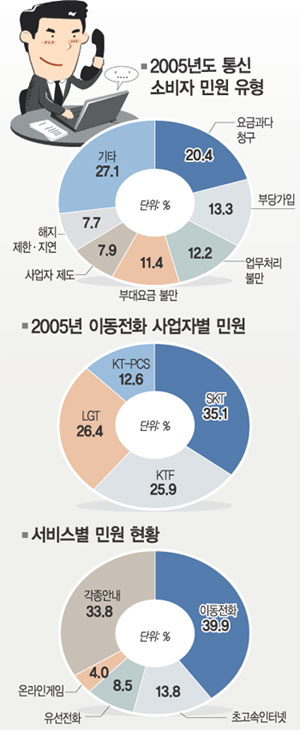 ¾÷üº°·Î À̵¿ÀüÈ­ »ç¾÷ÀÚ Áß SKÅÚ·¹ÄÞÀÌ 5,429°Ç(35.1%)À¸·Î °¡Àå ¸¹¾Ò°í LGÅÚ·¹ÄÞ 4,081°Ç, KTF 4,005°Ç, KT-PCS 1,940°Ç ¼øÀ̾ú´Ù. À¯¼±ÀüÈ­¿¡¼­´Â KT°¡ 2,487°Ç(75.8%)À¸·Î °¡Àå ¸¹¾Ò´Ù. Ãʰí¼ÓÀÎÅÍ³Ý ¹Î¿ø¿¡¼­´Â 2À§ »ç¾÷ÀÚÀÎ Çϳª·ÎÅÚ·¹ÄÞ(1,073°Ç)ÀÌ 1À§ KT(1,021°Ç)º¸´Ù ¸¹Àº ºÒ¸¸À» »ò´Ù.
