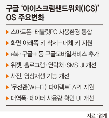 Áö³­ 12ÀÏ ¾ÖÇÃÀÌ £§¾ÆÀÌÆù¡¤¾ÆÀÌÆÐµå£§¿ë £§iOS5£§¸¦ Á¦°øÇϱ⠽ÃÀÛÇÑ µ¥ À̾î, ±¸±Ûµµ »õ·Î °³¹ßÇÑ ½º¸¶Æ®Æù¡¤ÅÂºí¸´PC¿ë ÅëÇÕ OS £§¾ÆÀ̽ºÅ©¸²»÷µåÀ§Ä¡(ICS)£§¸¦ Á¶¸¸°£ °ø°³ÇÑ´Ù. »ï¼ºÀüÀڴ ù ¹øÂ° ICSÆù £§°¶·°½Ã³Ø¼­½º£§¸¦ °ø°³ÇÏ¸ç ±¸±Û¿¡ ´ëÇÑ ¸·ÈÄ Áö¿ø¿¡ ³ª¼³ ¿¹Á¤ÀÌ´Ù.