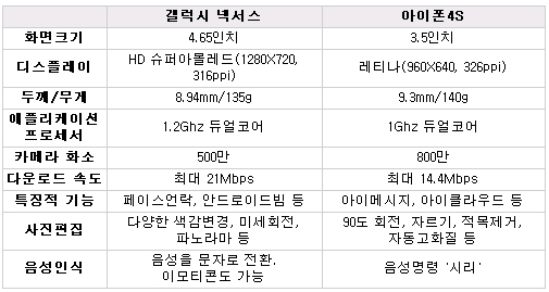 ¶Ç °¶·°½Ã ³Ø¼­½º°¡ ´õ ³ôÀº ÇØ»óµµ¿Í Å« È­¸éÀ» °®Ãè´Ù. ´Ü, ÀÎÄ¡´ç Çȼ¿¼ö´Â 316ppiÀÇ °¶·°½Ã ³Ø¼­½ºº¸´Ù 326ppiÀÇ ¾ÆÀÌÆù4S°¡ ³ô´Ù. Ä«¸Þ¶ó È­¼Ò¼öµµ ¾ÆÀÌÆù4S°¡ 800¸¸ È­¼Ò·Î °¶·°½Ã ³Ø¼­½ºÀÇ 500¸¸È­¼Òº¸´Ù ¾Õ¼±´Ù.