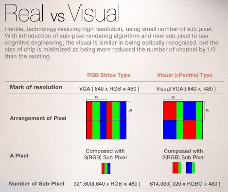 ÇÏÁö¸¸, È­ÁúÀ» ¼¼¹ÐÇÏ°Ô µûÁö°Ô µÇ¸é Â÷À̰¡ ¶Ñ·ÇÇÏ°Ô ³ªÅ¸³ª°Ô µÈ´Ù. ¿ì¼± ÆæÅ¸ÀÏ¿¡¼± ¼­ºê Çȼ¿ÀÇ Å©±â°¡ RGBº¸´Ù Ä¿´Ù. ÇϳªÀÇ Çȼ¿ Å©±â¸¦ 1À̶ó°í Çϸé RGB¿¡¼­´Â °¢°¢ÀÇ Å©±â°¡ 1/3ÀÌ µÇÁö¸¸, ÆæÅ¸ÀÏ¿¡¼± 2/3°ú 1/3À¸·Î ÀÌ·ç¾îÁø´Ù. ºñ·Ï ¼­ºê Çȼ¿ÀÇ Å©±âÀ̱ä ÇÏÁö¸¸, ÀÌ·± Á¡Àº È­Áú¿¡ ¿µÇâÀ» ÁÖ°Ô µÈ´Ù.