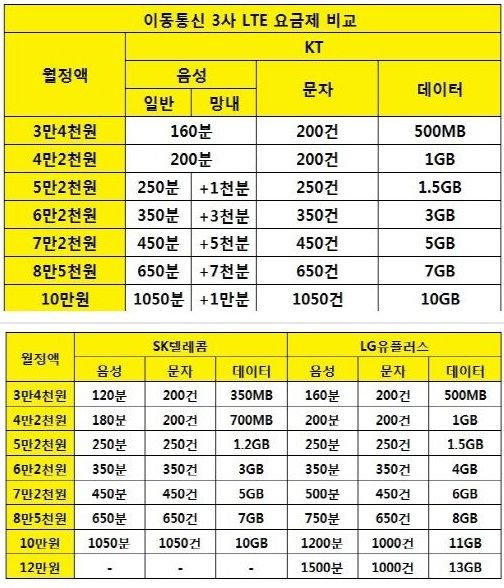 ±âº» Á¦°ø ¹«¼± µ¥ÀÌÅÍ´Â 6¸¸2õ¿ø ÀÌ»ó ¿ä±ÝÁ¦ ±âÁØ SKÅÚ·¹ÄÞ°ú µ¿ÀÏÇÏ´Ù. 6¸¸2õ¿ø 3GB, 7¸¸2õ¿ø 5GB, 8¸¸5õ¿ø 7GB, 10¸¸¿ø 10GB µîÀÌ´Ù. LGÀ¯Ç÷¯½º¿Í ºñ±³ÇÏ¸é °¢°¢ 1GB¾¿ Àû´Ù.