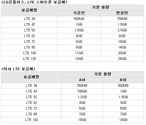 LTE34 ¿ä±ÝÁ¦´Â ±âÁ¸ 500¸Þ°¡¹ÙÀÌÆ®(MB)¿¡¼ 750MB·Î, LTE42´Â 1GB¿¡¼ 1.5GB, LTE52´Â 1.5GB¿¡¼ 2.5GB·Î ¿ë·®À» ´Ã¿´´Ù.