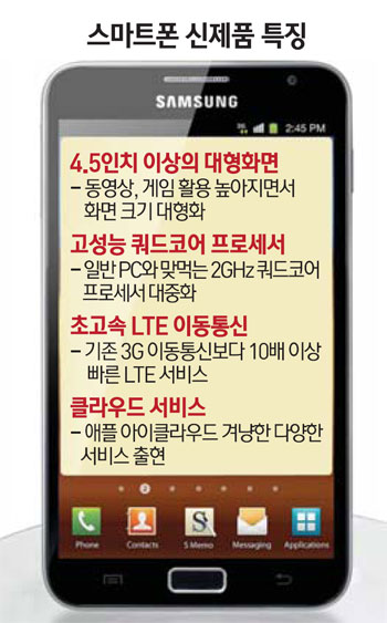 ¿ÃÇØ ÀÌÈÄ ½º¸¶Æ®Æù ½ÃÀåÀÇ °¡Àå Å« Ư¡Àº ¢Ë4.5ÀÎÄ¡ ÀÌ»óÀÇ ´ëÇü È­¸é ¢Ë°í¼º´É ÄõµåÄÚ¾î ÇÁ·Î¼¼¼­ ¢ËÃʰí¼Ó LTE À̵¿Åë½ÅÀ¸·Î ¿ä¾àµÈ´Ù. ´õ¿í Ä¿Áø È­¸é°ú ÇÑÃþ »¡¶óÁø ÇÁ·Î¼¼¼­°¡ žÀçµÇ°í À̸¦ Áö¿øÇÏ´Â LTE ¼­ºñ½º°¡ ´ëÁßÈ­µÇ´Â ¿ø³âÀÌ µÉ °ÍÀ̶ó´Â ¾ê±â´Ù. ¿©±â¿¡´Ù ¾Õ¼­ ½º¸¶Æ®ÆùÀ» ±¸ÀÔÇß´ø »ç¿ëÀÚµéÀÇ ¾àÁ¤±â°£µµ ´ë°Å ¸¸·áµÉ ¿¹Á¤À̾ ½ÅÁ¦Ç°À» ¾Õ¼¼¿î ÁÖ¿ä ¾÷üÀÇ ÁÖµµ±Ç °æÀïÀº ÇÑÃþ ´Þ¾Æ¿À¸¦ °ÍÀ¸·Î Àü¸ÁµÈ´Ù.