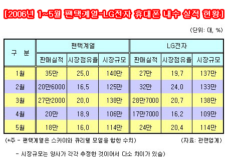 ÆÒÅð迭°ú LGÀüÀÚ°¡ ¿Ã »ó¹Ý±â ÈÞ´ëÆù ³»¼ö½ÃÀå¿¡¼­ ³ªÅ¸³½ Á¡À¯À²À» »ìÆìº¸¸é, ÆÒÅð迭Àº 1, 4¿ù¿¡, LGÀüÀÚ´Â 2, 5¿ù¿¡ °¢°¢ »ó´ëÀûÀ¸·Î ¿ìÀ§¸¦ ³ªÅ¸³ÂÀ¸¸ç 3¿ùÀº ¾ùºñ½ÁÇÑ ¾ç»óÀ» º¸¿´´Ù.