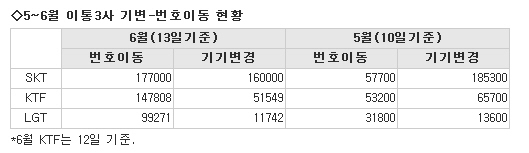 6¿ù 13ÀÏ ÇöÀç SKÅÚ·¹ÄÞÀÇ 6¿ù ±âº¯°¡ÀÔÀÚ´Â 16¸¸¿©¸íÀ¸·Î ¹øÈ£À̵¿ °¡ÀÔÀÚ 17¸¸7õ¸íÀ» ÇÏȸÇϰí ÀÖ´Ù. KTFÀÇ °æ¿ìµµ ±âº¯Àº 5¸¸¿©¸í¿¡ ±×Ä¡°í Àִµ¥ ¹ÝÇØ ¹øÈ£À̵¿Àº 14¸¸¸íÀ» ¿ôµ¹ Á¤µµ·Î ¹øÈ£À̵¿ÀÌ ±âº¯À» Å©°Ô ¿ôµ¹°í ÀÖ´Ù.
