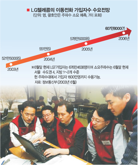 ¡ßÁ¤Ã¥ µû·Î ½ÃÀå µû·Î=Á¤ºÎÀÇ 3¼¼´ë À̵¿Åë½ÅÁ¤Ã¥ÀÌ ½ÃÀåÀ̳ª ±â¼ú¹ßÀüÃß¼¼¿Í µû·Î ³î¾Ò´Ù´Â ºñÆÇÀ» ¸éŰ Èûµé´Ù. ¾Õ¼­ Á¤ÅëºÎ´Â 2003³â 6¿ù LGT¿¡°Ô 2§×´ë¿ªÀÇ µ¿±â½Ä IMT¼­ºñ½º¸¦ 2006³â 6¿ù ¸»±îÁö ´ÊÃçÁá´Ù. Á¤ºÎ´Â À̶§ ±âÁ¸ 1.8§×´ë¿ªÀÇ Á֯ļö°¡ Æ÷È­»óÅ¿¡ À̸¦ °ÍÀ¸·Î ³«°üÇß´Ù. ÀÌ ¿¹Ãø¿¡ µû¸£¸é LGTÀÇ °¡ÀÔÀÚ´Â 2006³â ¸» 607¸¸8000¸í¿¡ À̸£°í Á֯ļöµµ Æ÷È­»óÅÂÀÎ 7°³¿¡ À̸¦ °ÍÀ¸·Î ¿¹»óµÆ´Ù. ±×·¯³ª ÇöÀç LGTÀÇ °¡ÀÔÀÚ°¡ 6¿ù ¸» ÇöÀç 676¸¸4638¸íÀ¸·Î ¿¹ÃøÄ¡¸¦ Èǽ ³Ñ¾î¼¹Áö¸¸ Á֯ļö´Â ¼­¿ï °æ±â±Ç 4°³(Áö¹æÀº 1¡­2°³)·Î ³²¾Æµ¹°í ÀÖ´Ù. ƯÈ÷ 2¼¼´ëÀÇ ÁøÈ­µÈ ±â¼úÀÎ ¡®¸®ºñÀü A¡¯±îÁö »ó¿ëÈ­µÉ °æ¿ì ±âÁ¸ Á֯ļö¿¡¼­µµ ¹«·Á 1600¸¸¸í±îÁö ¼ö¿ëÇÒ ¼ö ÀÖ´Ù´Â °Ô LGTÀÇ ¼³¸íÀÌ´Ù. Á¤ºÎÀÇ Á֯ļö ¿¹ÃøÀÌ ÇÑÂü ºø³ª°¬´ø ¼ÀÀÌ´Ù.