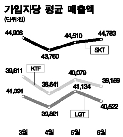 ÇÑÆí °¡ÀÔÀÚ ´ç Æò±Õ ¸ÅÃâ¾×(ARPU)µµ Á»Ã³·³ ´Ã¾î³ªÁö ¾Ê°í ÀÖ´Ù. °¡ÀÔÀÚ°¡ ´Ã¾î³ªÁö ¾ÊÀ¸¸é ARPU¶óµµ ´Ã¾î¾ß Áö¼ÓÀûÀÎ ¼ºÀåÀ» ±â´ëÇÒ ¼ö ÀÖÁö¸¸ À̸¶Àúµµ ¿©ÀÇÄ¡ ¸øÇÑ »óȲÀÌ´Ù. SKTÀÇ °æ¿ì Áö³­ 6¿ù ARPU´Â 4¸¸4,783¿øÀ¸·Î Áö³­ 3¿ùÀÇ 4¸¸4,908¿ø¿¡ ºñÇØ 125¿øÀ̳ª ÁÙ¾ú´Ù. KTFÀÇ 6¿ù ARPUµµ 3¸¸9,159¿øÀ¸·Î 3¿ù(3¸¸9,611¿ø)º¸´Ù ¹«·Á 452¿øÀ̳ª °¨¼ÒÇß´Ù. .