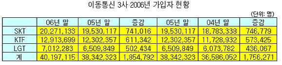 KTF´Â Áö³ÇØ 61¸¸1342¸íÀÇ °¡ÀÔÀÚ¸¦ »õ·Î È®º¸ÇØ ¿¬¸» 1291¸¸3699¸íÀÇ ´©Àû°¡ÀÔÀÚ¸¦ ±â·ÏÇß´Ù. Áö³ 2005³â 57¸¸3425¸íÀÇ °¡ÀÔÀÚ¸¦ ´Ã¸° °Í¿¡ ºñÇØ Áö³ÇØ¿¡´Â °¡ÀÔÀÚ È®´ëÆøÀÌ ´Ù¼Ò ´Ã¾î³µ´Ù.