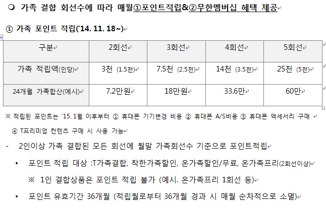 2ÀÎ ÀÌ»ó ÈÞ´ëÆù °áÇÕÇÑ ¸ðµç °¡Á·¿¡°Ô ¸Å¿ù ÃÖ´ë 2¸¸5õ¿ø Æ÷ÀÎÆ® Àû¸³& ¹«ÇѸâ¹ö½Ê ÇýÅà Á¦°ø - SKT¿¡¼ ¿î¿µ ÁßÀÎ °¡Á· °áÇÕ»óǰ(T°¡Á·ÇýÅÃ, ÂøÇÑ °¡Á·ÇÒÀÎ, ¿Â°¡Á·ÇÒÀÎ/¹«·á/ÇÁ¸®) Áß 1°¡Áö ÀÌ»ó¿¡ 2ÀÎÀÌ»ó °áÇÕµÈ ¸ðµç °í°´¿¡°Ô ÀÚµ¿À¸·Î ÇýÅà Á¦°ø(º°µµ ½Åû ÇÊ¿ä ¾øÀ½) - ÇöÀç °áÇÕÇÏÁö ¾ÊÀº ±âÁ¸ °í°´µµ 2ÀÎ ÀÌ»ó °¡Á· ÈÞ´ëÆù °áÇÕ¸¸ Çϸé ÇýÅà Á¦°ø - Àû¸³µÈ Æ÷ÀÎÆ®´Â °¡Á·ÀÌ ±â±âº¯°æ ½Ã, Çö±Ýó·³ »ç¿ë °¡´É - ¼ºñ½º ÀÌ¿ë½Ã ¹«ÇÑ ¸â¹ö½Ê Àû¿ë