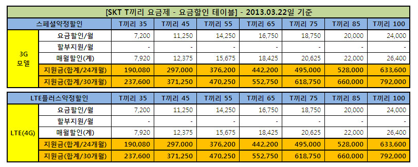 2. T³¢¸® ¿ä±ÝÁ¦ Ãâ½Ã - 2013.3.22 ¡Ý T³¢¸® ¿ä±ÝÁ¦·Î SKT °í°´³¢¸®´Â ¸Á³» À½¼º ¹«Á¦ÇÑ »ç¿ë(3G/4G) ¡Ø ¿ä±ÝÁ¦º° ¿ä±ÝÇÒÀÎÀº ¾Æ·¡ ³»¿ë ÂüÁ¶ Çϼ¼¿ä.