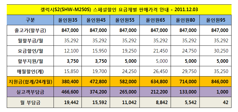 Á¦¸ñ ¡æ SKT °¶·°½ÃS 2(SHW-M250S) - ½ºÆä¼ÈÇÒÀÎ ¿ä±ÝÁ¦º° ÆÇ¸Å°¡°Ý Å×À̺í